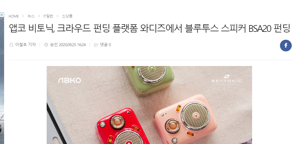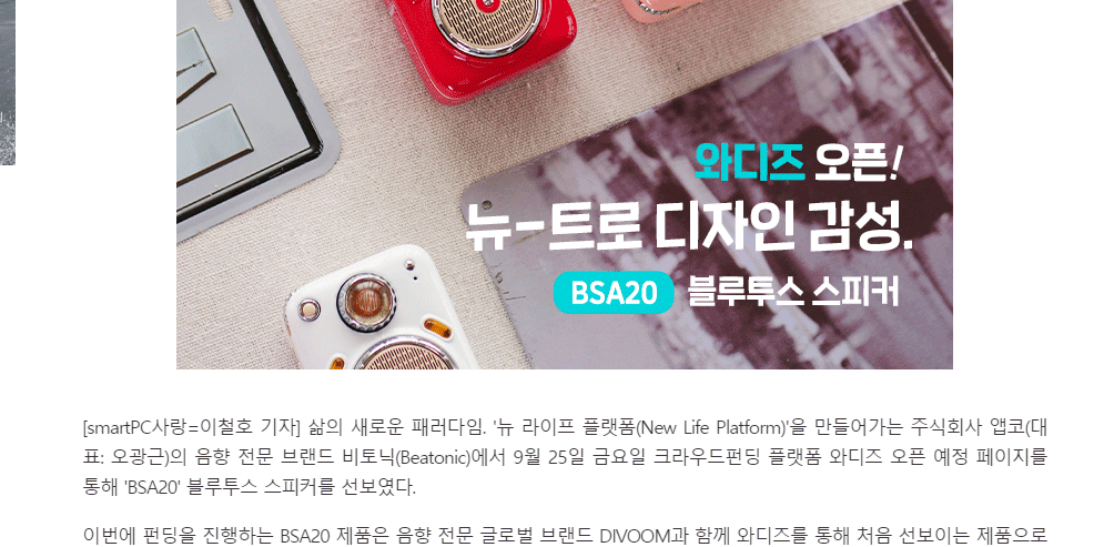 앱코 비토닉, 크라우드 펀딩 플랫폼 와디즈에서 블루투스 스피커 BSA20 펀딩 시작